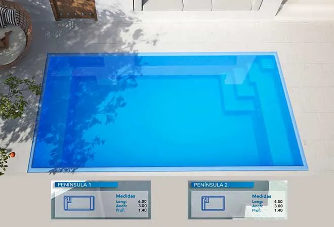 Piscina modelo Península Medidas Elige tu color Color estandar Colores Gota Color especiales Color especiales con efecto Gama natural